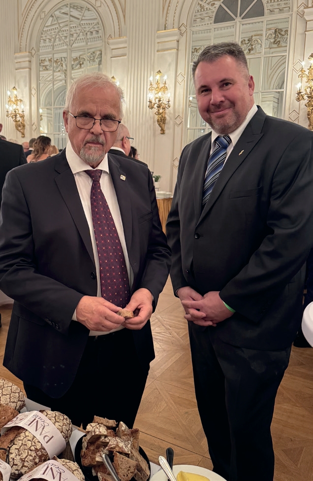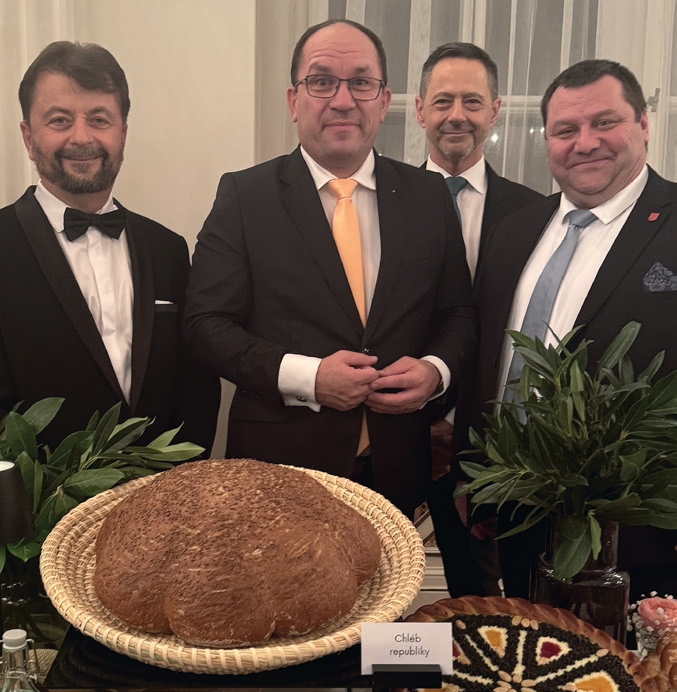 A protože šlo o nejdůležitější státní svátek s oslavou vzniku našeho státu, nabízelo se připomenout náš úspěšný projekt Chléb republiky ze Dnů lidí dobré vůle na Velehradě. Na Pražský hrad jsme proto ve spolupráci s pekaři z Ireksu opět napekli několik Chlebů republiky a připravili i symbolickou výstavu mouky ze 14 krajů i vody ze tří řek a vše představili v průběhu slavnostního setkání, jež se konalo v úterý 28. října. Kromě ústředního motivu Chleba republiky jsme zde nabídli i jeden z vítězných chlebů ze soutěže Chléb roku 2025 od společnosti Backaldrin, širokou škálu slaného pečiva připraveného speciálně pro tuto příležitost Ireksem, hodovní koláčky, které napekl Petr Křivka, a přehlídku dalšího sladkého pečiva. Poprvé jsme prezentovali i bezlepkové pečivo, a to z pekárny Martina Knappeho z Opavy.